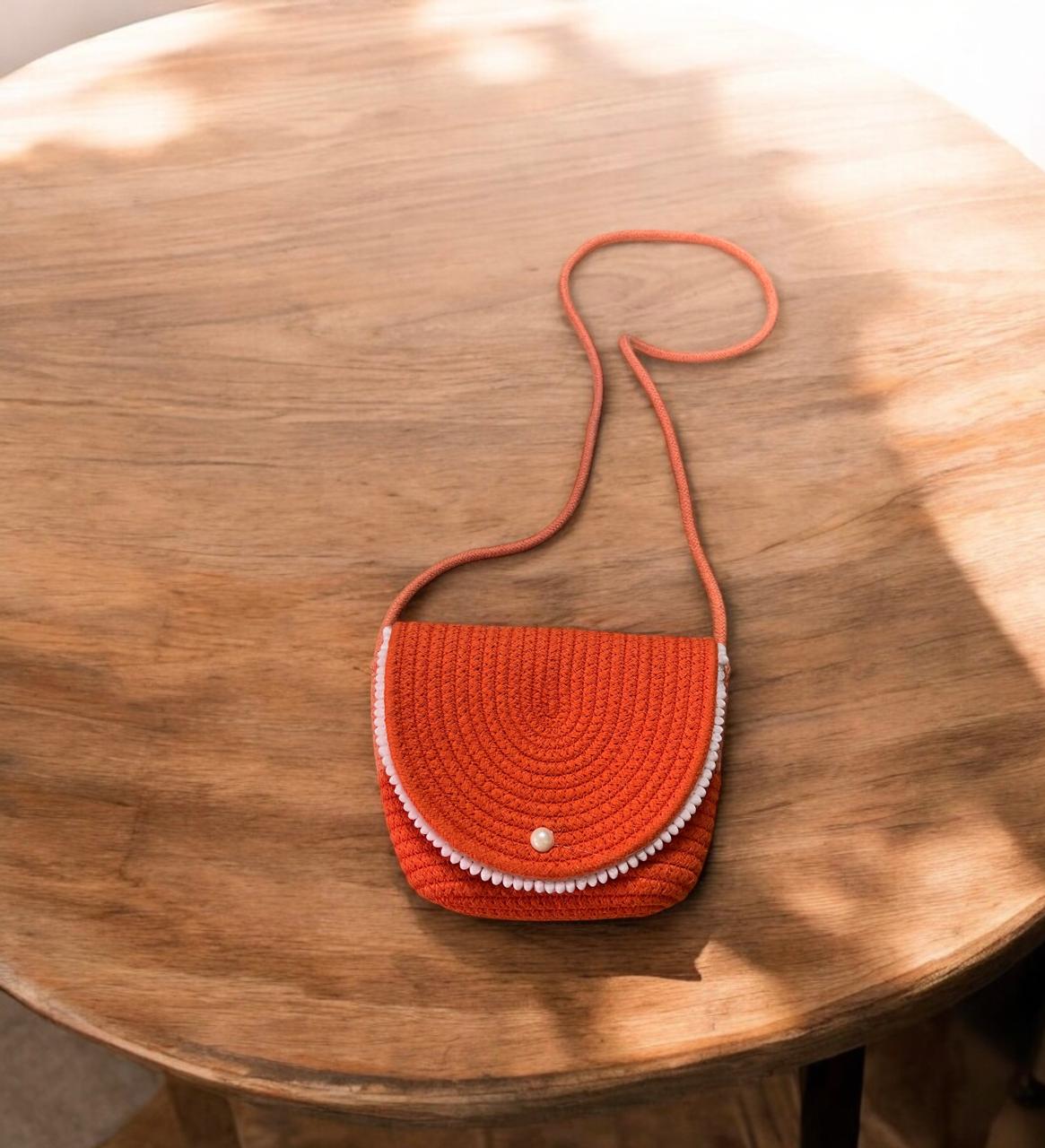 Expertly crafted from 100% cotton rope, this orange flap bag is both stylish and functional. Its durable construction and ample size of 8.7 inches make it the perfect accessory for everyday use. Show off your unique sense of style while carrying all your essentials with ease.
