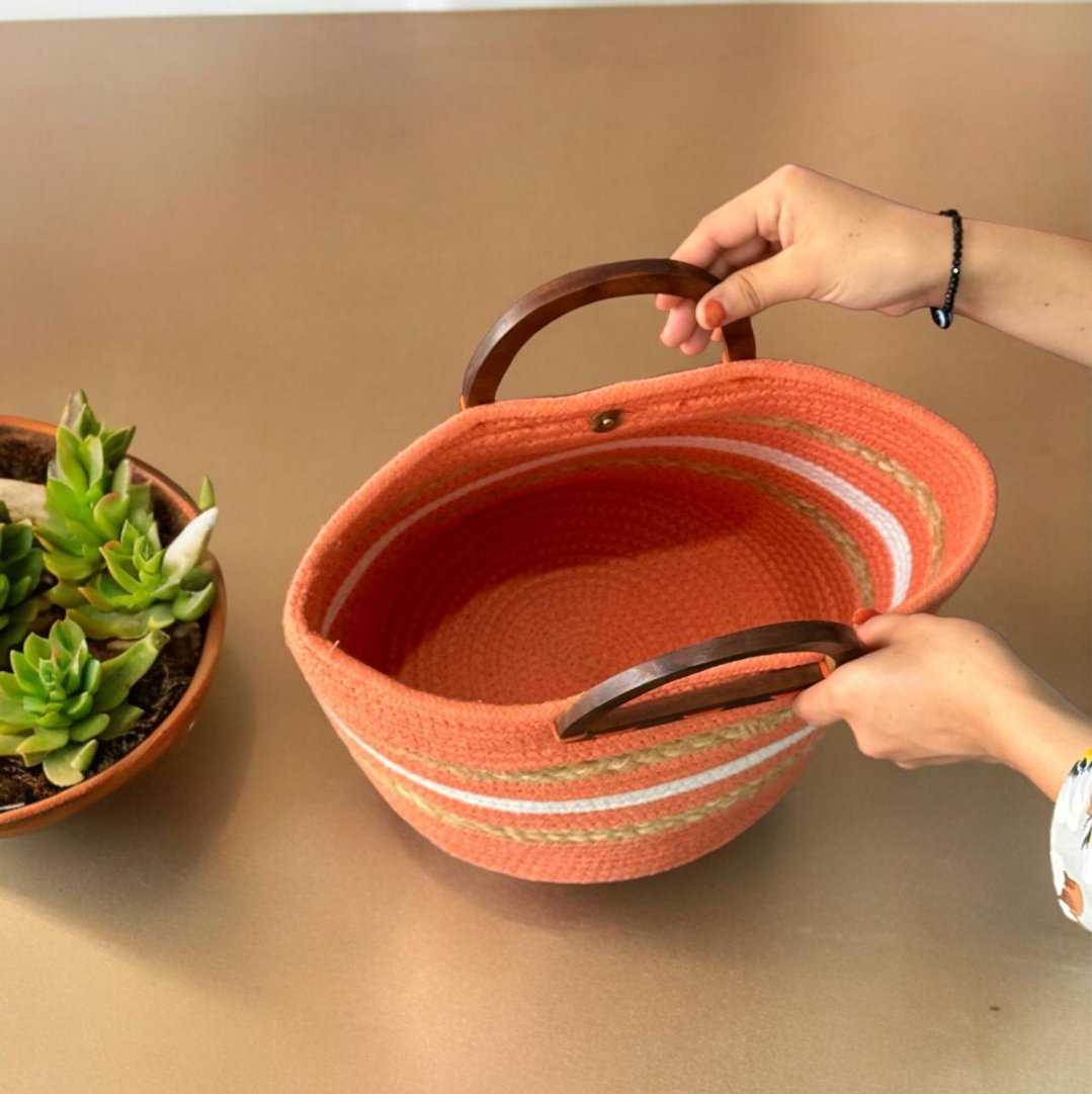 Orange Jute Bag with Wooden Handle
