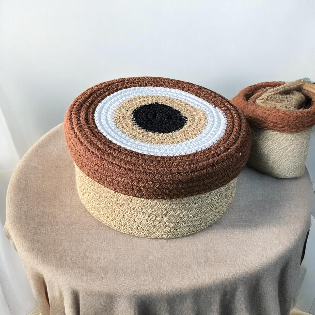 Organize and protect your treasures with our Round Cotton Jute Basket. The black-and-white lid adorned with a brown evil eye motif adds a touch of elegant protection. This 8x4 inch basket is perfect for storing jewelry, candles, keys, or secret stashes. Keep your space clutter-free with this modern-day "storage talisman.". (8in x 4in)