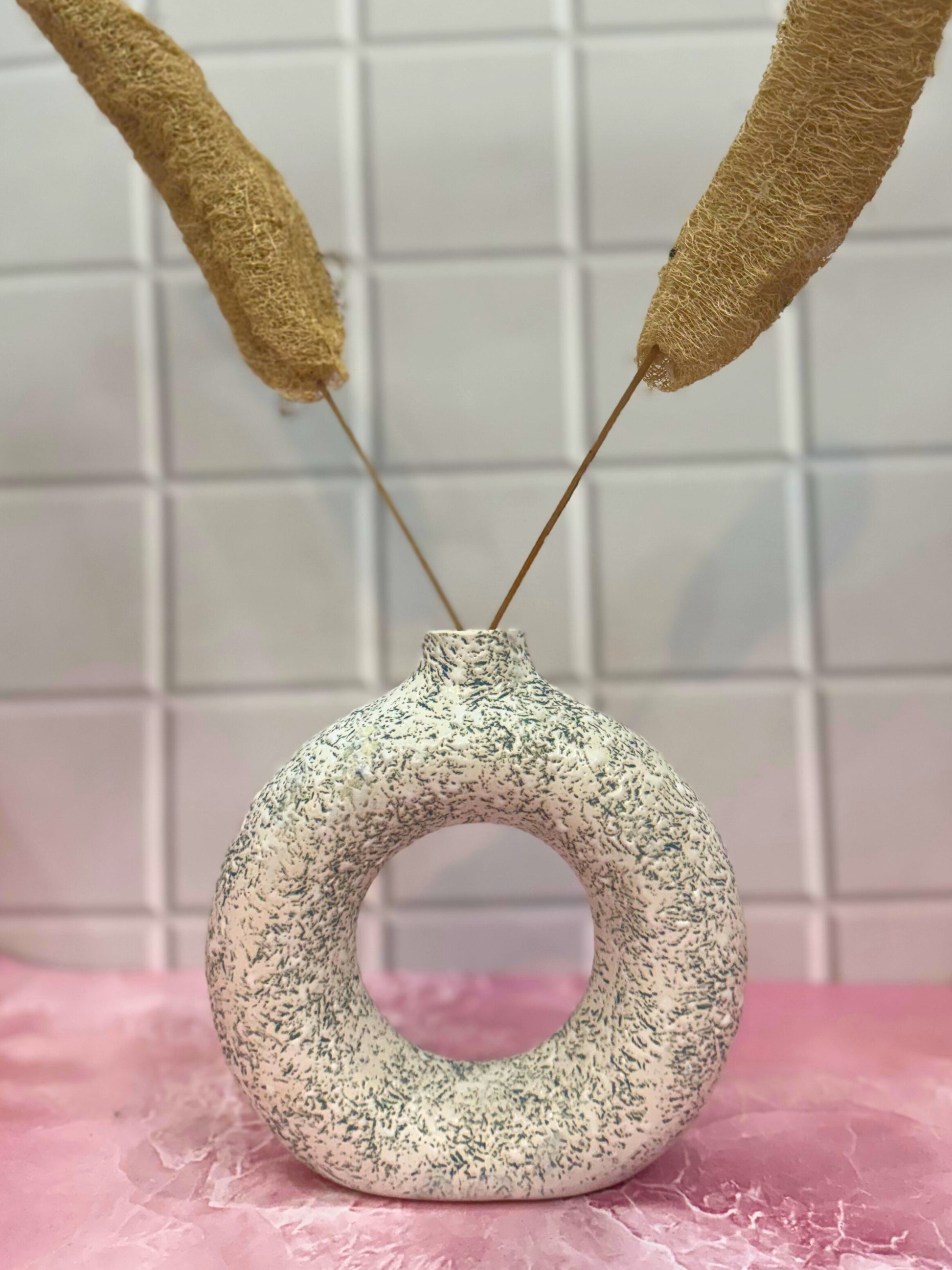 Add some whimsy to your home decor with the Yubi Sora Ceramic Donut Vase! Its round shape and white color make it a versatile canvas for showcasing flowers or reeds. With each vase being handmade, you can trust in its quality and durability. Let your creativity run wild with this fun and playful addition to your indoor table.