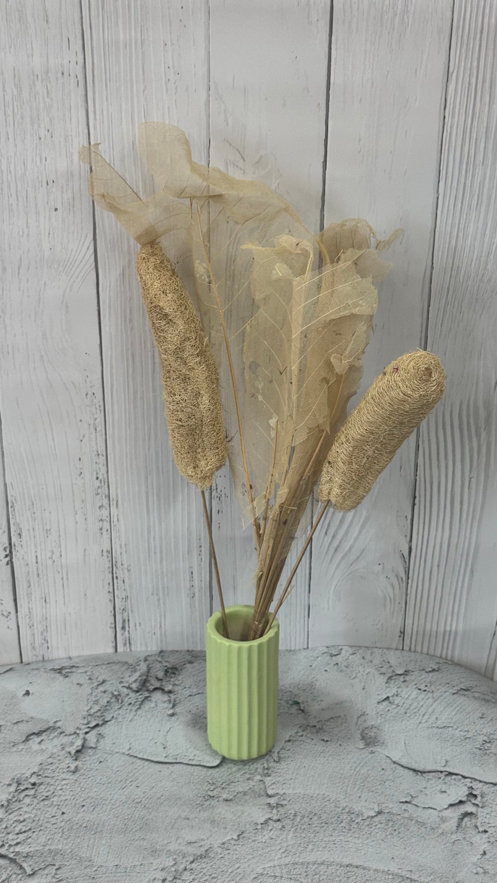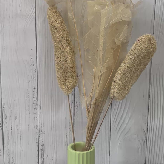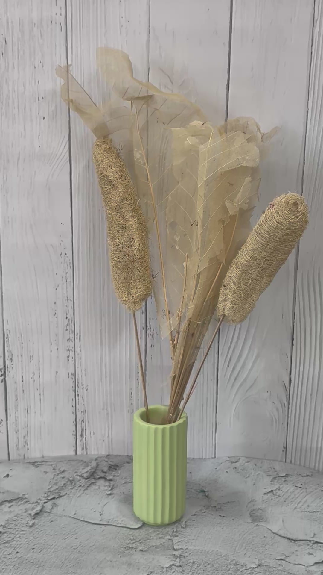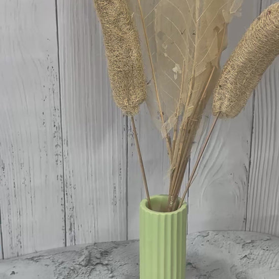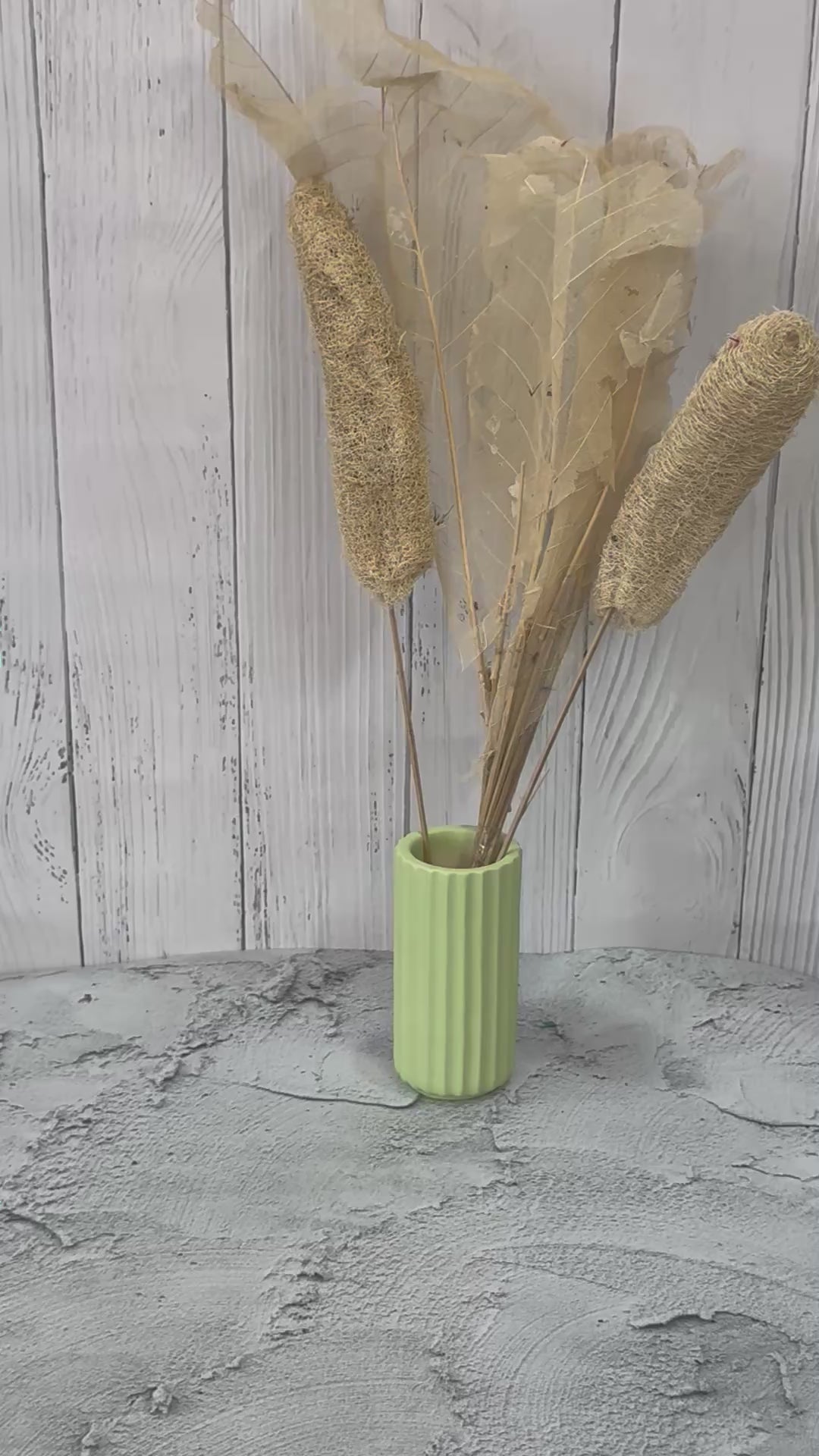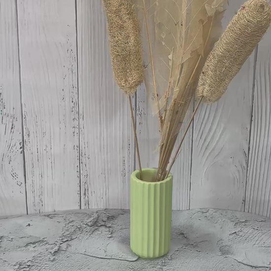Add a splash of charm with the Yubi Sora green can-shaped vase! Its playful ribbed design and calming light green color bring a fun yet soothing vibe to any room. Perfectly shaped like a cylinder, it brightens up colorful living rooms and lively washroom planters with a cheerful touch.